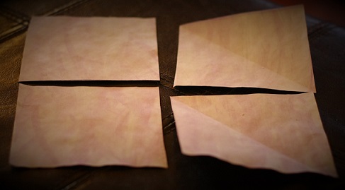 Fold this large square in half, then in half again. You will end up with folds that will be four squares. Cut these into four squares.