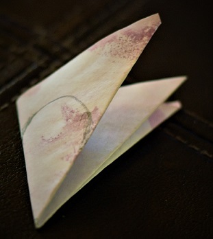 Fold one corner up to the one above, making a triangle. Fold side A to B, making a smaller triangle.