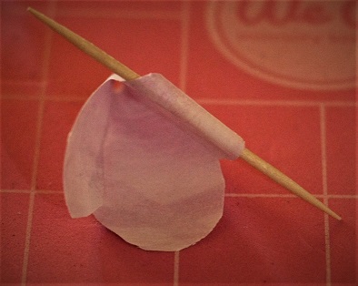 Before adding the rest of the petal shapes to the base, take a wood skewer, {or whatever you have that will work} and curl each petal around it like this: