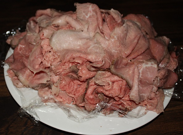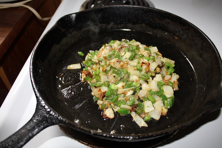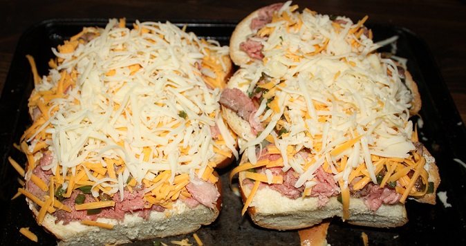 Place bread on baking pan. You can brush the open bread with olive oil and fresh minced garlic. I do! Top with the beef and onion mixture.