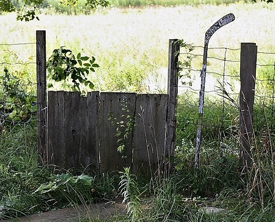 I found this old hockey stick leaning against the fence and thought about who might have left it there. It was in a vacant lot.